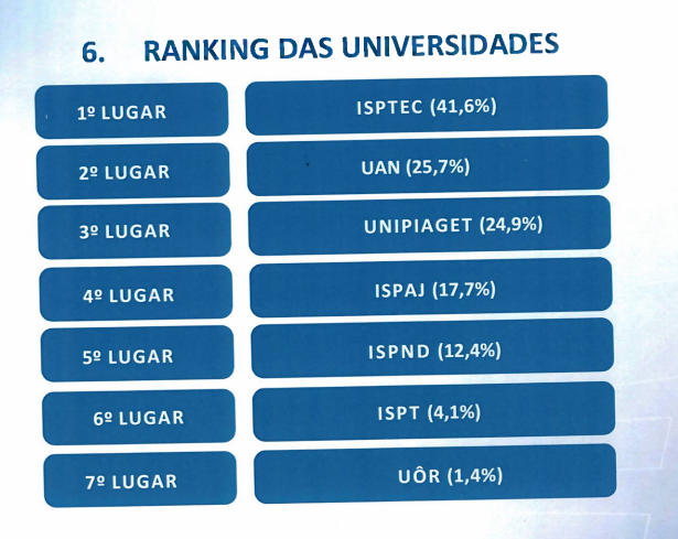 A Rede Nacional de Transportes de Electricidade (RNT) promoveu, na manhã desta Terça-feira, 18 de Novembro, a Sessão de Apresentação do Ranking das Universidades, na qual o ISPTEC se destacou como líder na classificação relativa aos estágios profissionais realizados na empresa, no âmbito da parceria com as Instituições de Ensino Superior (IES). O estudo avaliou sete IES nacionais, com a seguinte classificação: 1.º ISPTEC (41,6%), 2.º UAN (25,7%), 3.º UNIPIAGET (24,9%), 4.º ISPAJ (17,7%), 5.º ISPND (12,4%), 6.º ISPT (4,1%) e 7.º UÓR (1,4%).