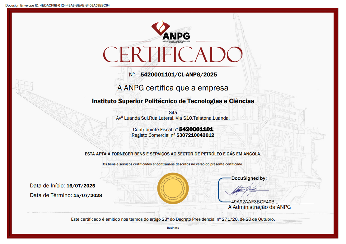 Assunto: ISPTEC Obtém Certificação da Agência Nacional de Petróleo e Gás O ISPTEC foi oficialmente certificado pela Agência Nac...